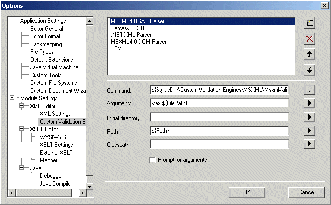 5. Click Prompt for arguments if you want Stylus Studio to display a dialog box that allows the user to change the command line or arguments when the custom validation engine is run.