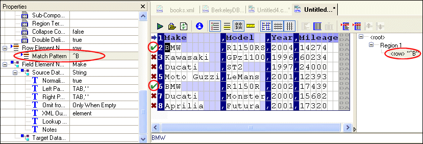 Home > Online Product Documentation > Table of Contents > Pattern Matching Pattern MatchingYou can use regular expressions to specify match patterns for the rows in the input file. Only those rows in the input file that match the pattern you specify are output to XML when the file is converted. The simplest way to define a match pattern is to use the Match Pattern property in the Row Element Name section of the Properties window. ExampleConsider the following input file: