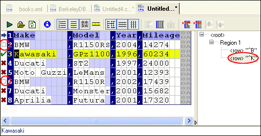 When you define multiple match patterns, the document pane displays a gray square alongside rows that match a pattern other than the one, if any, associated with the currently selected row. In