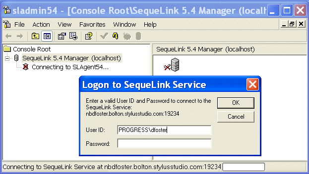 4. Enter a user ID and password and click OK to connect to the SequeLink Service you created when you installed the DataDirect SequeLink SocketServer. (This will be the user ID and password for the machine on which you installed the DataDirect SequeLink SocketServer.)