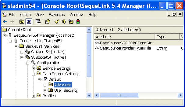 5. Once you are connected, expand the SLSocket54 [active] branch as follows: Configuration > Data Source Settings > Default > Advanced. When you are done, your sladmin window should look like this: