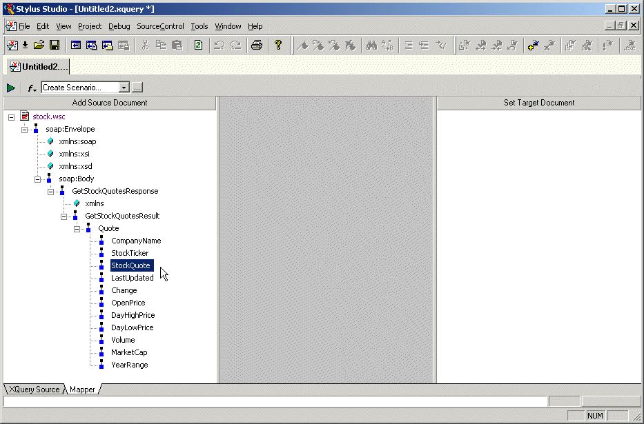 The saved Web service call can be used as the source document for an XQuery in the XQuery mapper, as shown in Figure 351:
