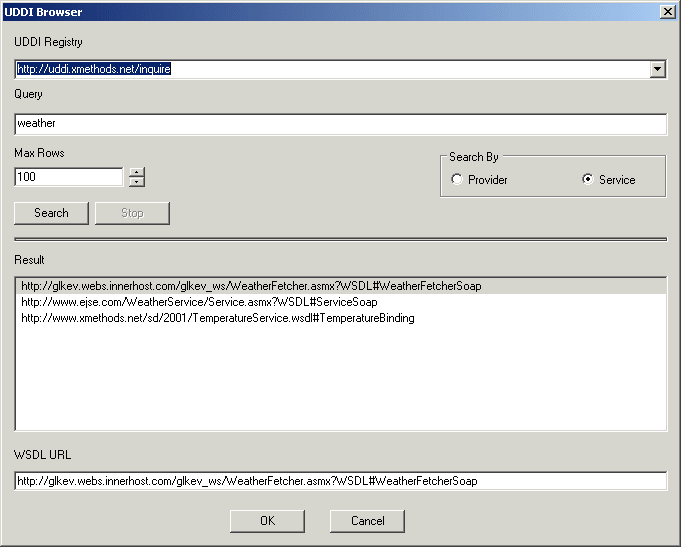 If you do not see a suitable WSDL URL in the UDDI registry you searched, modify your query in the UDDI Browser and try your search again, or search a different UDDI registry.