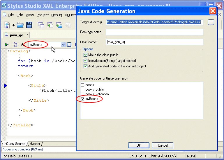 You can generate Java code for one or more of the scenarios defined for a single XQuery document. By default, the Java Code Generation wizard selects only the current scenario for generation, as shown in