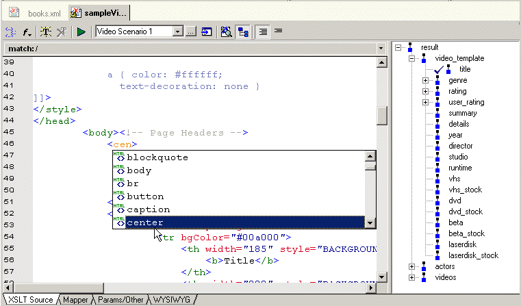 Finally, you can also use the tree to move quickly among different XSLT templates - clicking a node in the tree places the cursor at the corresponding template in the XSLT source.