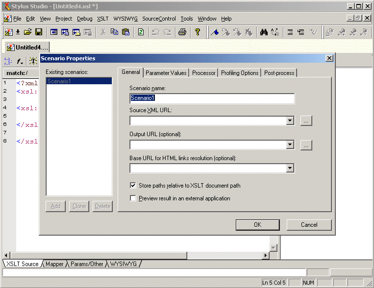 Stylus Studio displays a new untitled stylesheet and the Scenario Properties dialog box, and selects the text in the Scenario Name field.
