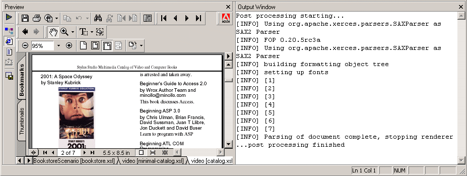 After a few seconds, the Preview window displays the PDF result in Acrobat Reader. The result contains a few lines of text for each video and book found in the XML source documents. The title, author or director, and the description is included for each item. It is hard to see where information for one item ends and another begins.