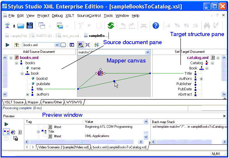 Home > Online Product Documentation > Table of Contents > Overview of the XSLT Mapper Overview of the XSLT MapperThe XSLT mapper helps you compose XSLT that aggregates data from one or more source documents, regardless of their origin or XML. For example, an inventory application might use information from multiple vendors, each of whom organizes invoices in a different way. You can use the XSLT mapper to identify source documents, map the relevant nodes from each to a target document, and in doing that define any required XSLT instructions, XPath or Java functions, and logical operators graphically. To use the XSLT mapper to create an XSLT stylesheet, you start by specifying one or more source documents and one target document.