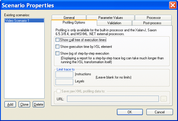 1. Open the Scenario Properties dialog box for the XSLT stylesheet. (Click Browse at the top of the XSLT editor window.)