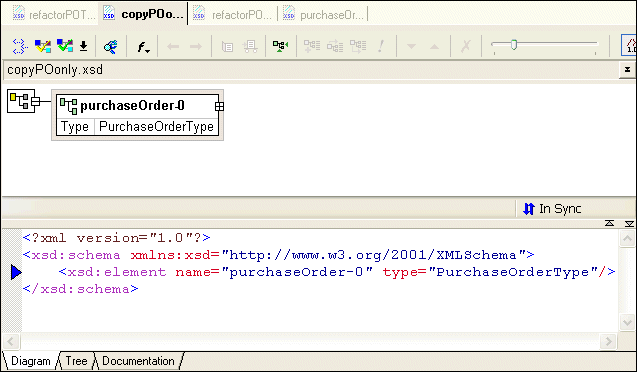 Refactoring is a process that allows you to copy globally defined nodes from one XML Schema and paste them in a new XML Schema. The difference between refactoring and a simple copy is that refactoring includes both the node you select and all its dependencies. Consider the following example: here is how the