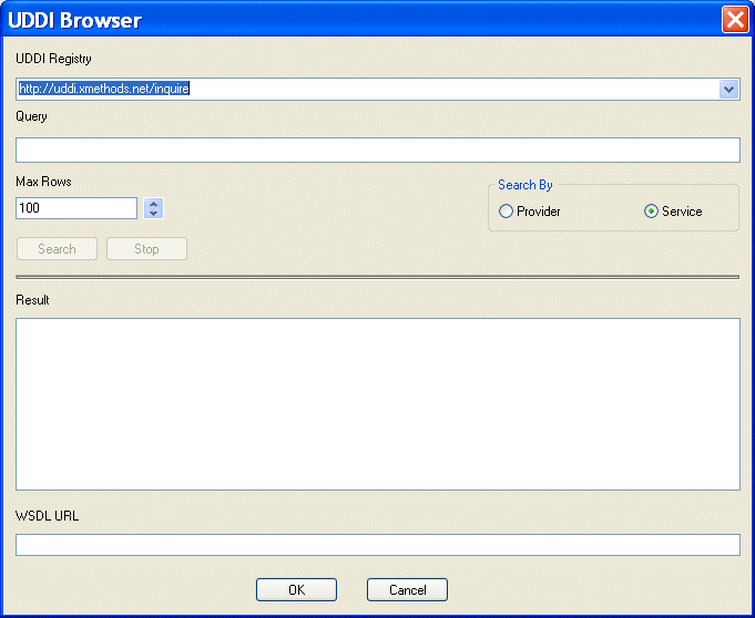 • Search By - whether you want to search the UDDI registry by company or by Web service (the default).