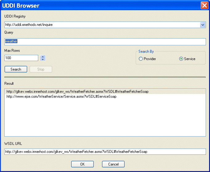 If you do not see a suitable WSDL URL in the UDDI registry you searched, modify your query in the UDDI Browser and try your search again, or search a different UDDI registry.