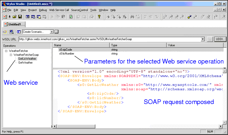 - The XML that describes the SOAP request associated with that operation. You can edit the SOAP request, but for initial testing you should restrict changes to providing parameter values, and you can use the parameter's