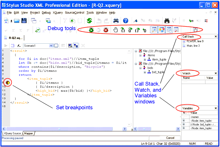 Figure 339. Debugging XQuery in Stylus Studio