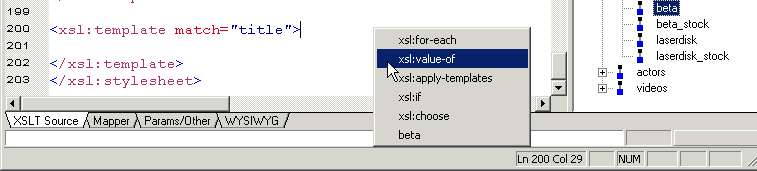 Finally, you can also use the tree to move quickly among different XSLT templates - clicking a node in the tree places the cursor at the corresponding template in the XSLT source. Sophisticated Editing EnvironmentThe Stylus Studio editor allows you to edit both the XML source document and the XSLT stylesheet. There is no need to memorize complicated syntax. As you type, Stylus Studio Sense:X technology automatically suggests XSLT or HTML tag and attribute names, and ensures that all XML is well formed.