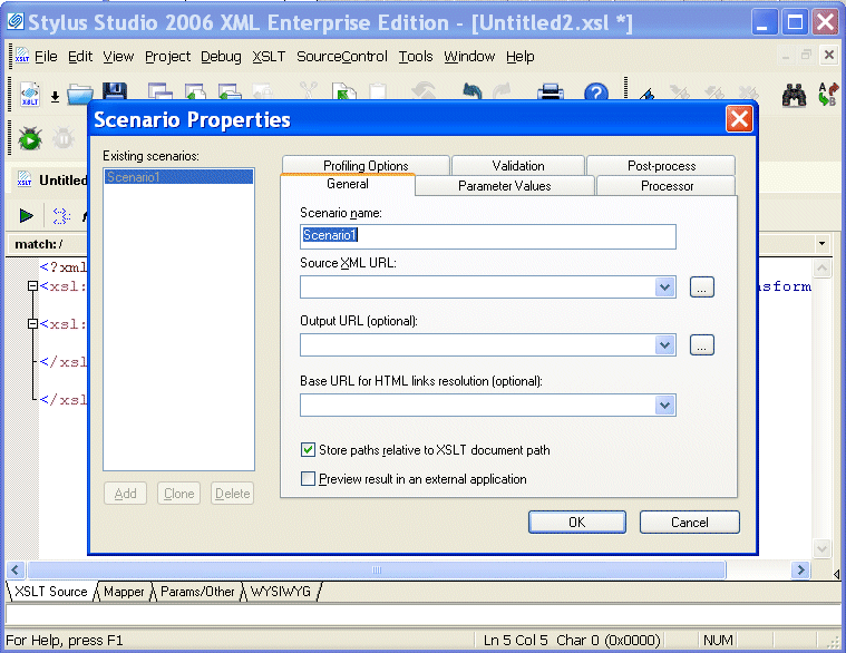 Stylus Studio displays a new untitled stylesheet and the Scenario Properties dialog box, and selects the text in the Scenario Name field.