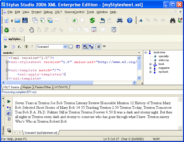 Stylus Studio displays the new stylesheet in the XSLT editor. A tree representation of the