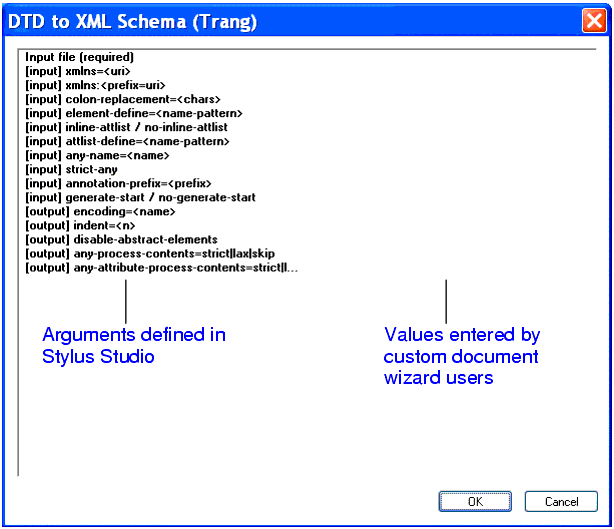 Home > Online Product Documentation > Table of Contents > Custom Document Wizards Custom Document WizardsStylus Studio's custom document wizard feature allows you to create and configure document wizards that invoke third-party file conversion and document generation tools, such as Thai Open Source's Trang. When run, a custom document wizard passes argument values provided by the user (the name of the file to be converted, for example) to the command line that invokes the third-party tool. The third-party tool generates an output file as specified in the custom document wizard's command line, and the file is then opened by Stylus Studio in the appropriate editor. An example of a custom document wizard is the DTD to XML Schema (Trang) document wizard shipped with Stylus Studio.