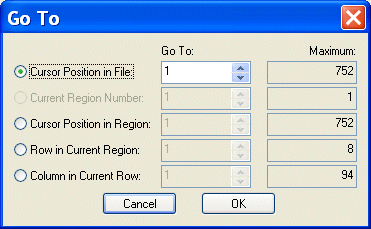 Using Go ToYou use the Go To dialog box to jump to a specific location in the file you are using to create your custom XML conversion definition. You can use it to move the cursor to a specific When you first display the Go To dialog box, values in the Go To fields reflect the cursor's current location within the file. The values in the Maximum fields display the maximum values for each category (file size, number of regions, and so on) for the portion of the file read into the Custom XML Conversions Editor Editor by Stylus Studio. To display the Go To dialog box, select Edit > Go To from the menu. |