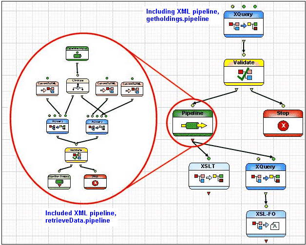 Including an XML pipeline refers to the process of inserting one XML pipeline inside another - instead of piping a node's output to an XQuery or XSLT transformation for processing, for example, output is piped to the included XML pipeline. That XML pipeline performs the processes defined by its nodes, and then returns one or more outputs to a node in the including XML pipeline for subsequent processing. Example