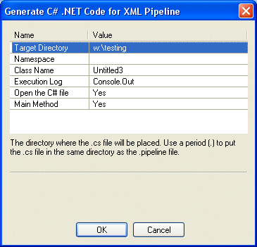 Generate C# .NET Code for XML Pipeline dialog box to specify