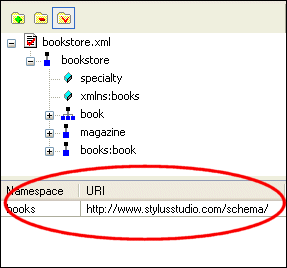 Working with NamespacesIf the document you have selected as a source uses a namespace prefix, Stylus Studio displays the prefix and the URI at the bottom of the data sources panel, as shown in Figure 439.