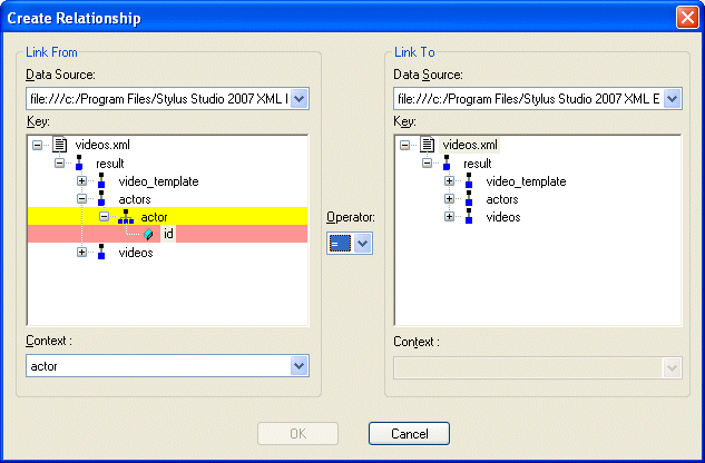 The Create Relationship dialog box appears. The tree for the document appears in the Link From field. The document that appears in the Link To field depends on how many data sources you added in step 1.