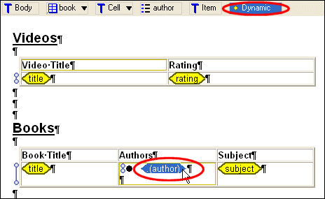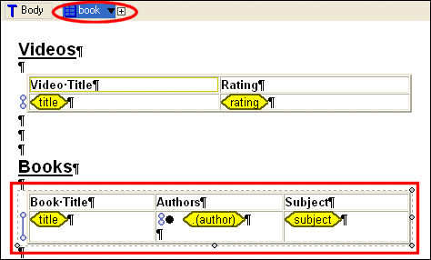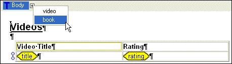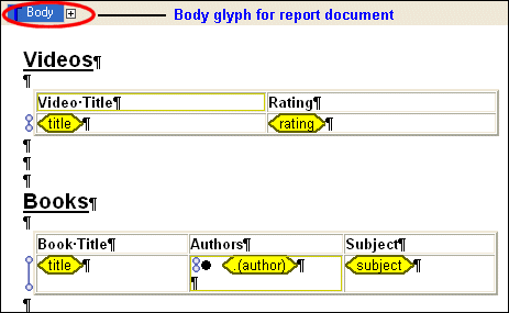 Body glyph indicates that the report body has at least one child. Our report has two children - the table containing video data, and the table containing book data. If we click the plus sign, Stylus Studio displays a drop-down menu that lists the children of the report body, and we see the entries for the
