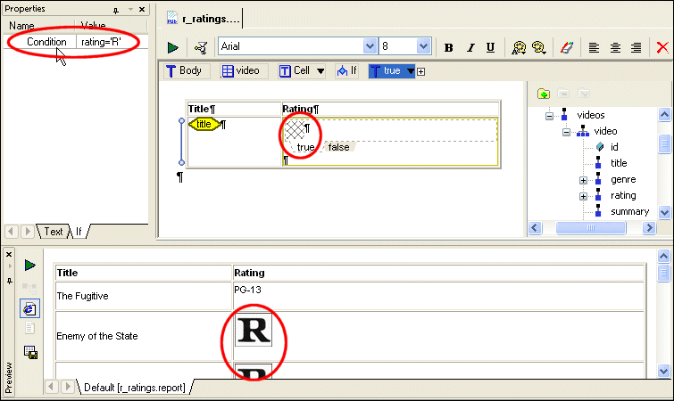 Home > Online Product Documentation > Table of Contents > Ifs IfsAn if is a component that represents a condition (if... then... else...). You can use if components to control report content. You can insert if components within other components (within a table cell, for example). Creating an IfThe easiest way to create an if component in XML Publisher is to select Report > Insert > If from the Stylus Studio menu, or select Insert If from the canvas short-cut menu. The if component's context is established automatically only if you insert within another component - such as a table or list - whose context is already set. The if component does not inherit its context from the body component. Graphical RepresentationIn the XML Publisher canvas, an if component is represented as two tabs, true and false, within a bounding box drawn with a dashed line. Figure 474 shows an empty if component.
