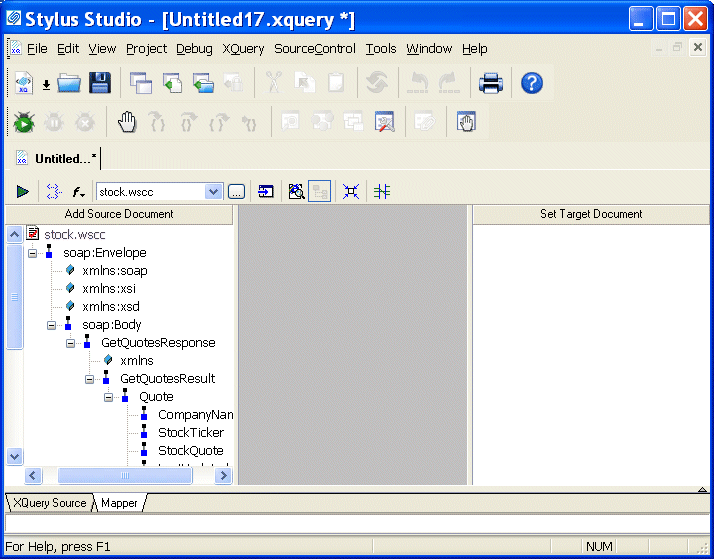 The saved Web service call can be used as the source document for an XQuery in the XQuery mapper, as shown in Figure 371: