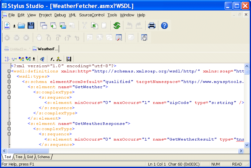 You can easily display a WSDL document within Stylus Studio once you have specified the WSDL URL. You might want to look at a WSDL document to learn more about the structure of the SOAP request, or to see if the Web service provider commented the XML to include information for developers using their Web service.