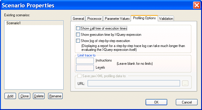 The XQuery Profiler is off by default. You enable the Profiler on the Profiling Options tab of the XQuery Scenario Properties dialog box.