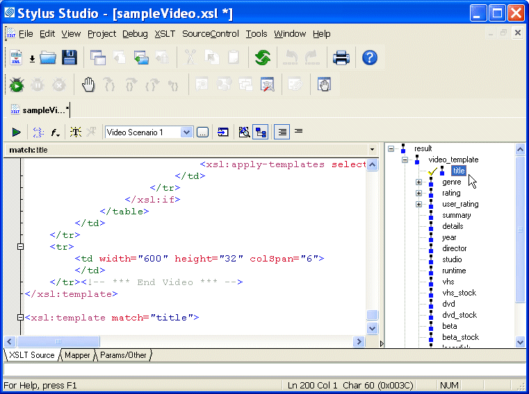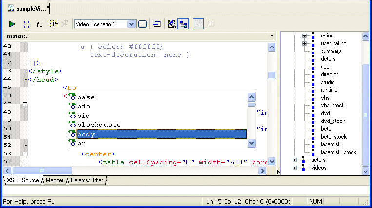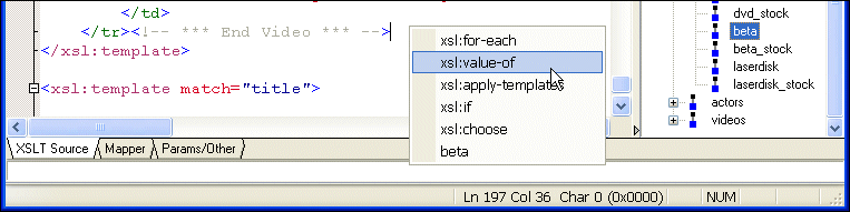 Finally, you can also use the tree to move quickly among different XSLT templates - clicking a node in the tree places the cursor at the corresponding template in the XSLT source. Sophisticated Editing EnvironmentThe Stylus Studio editor allows you to edit both the XML source document and the XSLT stylesheet. There is no need to memorize complicated syntax. As you type, Stylus Studio Sense:X technology automatically suggests XSLT or HTML tag and attribute names, and ensures that all XML is well formed.