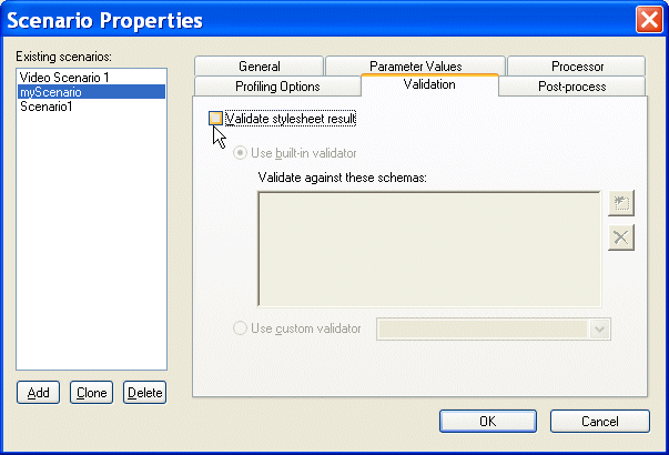 2. In the XSLT Editor ( XSLT Source or Mapper tabs), in the scenario name field, click the down arrow and click the name of the scenario for which you want to perform validation.