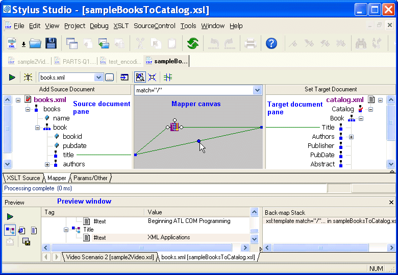 The XSLT mapper helps you compose XSLT that aggregates data from one or more source documents, regardless of their origin or XML. For example, an inventory application might use information from multiple vendors, each of whom organizes invoices in a different way. You can use the XSLT mapper to identify source documents, map the relevant nodes from each to a target document, and in doing that define any required XSLT instructions, XPath or Java functions, and logical operators graphically.