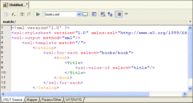 XSLT Source tab to see the new instructions in the template. (If you prefer, you can simply adjust the splitter between the XSLT source pane and the XSLT Mapper canvas.