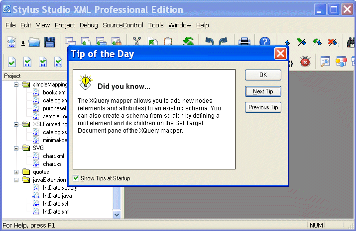 This icon is created by default during Stylus Studio installation. On startup, Stylus Studio displays the Tip of the Day dialog box, and the Project window.