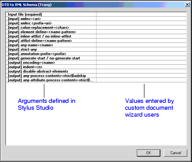 Trace executionIf the custom document wizard you are configuring outputs processing information (error messages, stack traces, and so on), you can use the Trace execution feature to display this information in the Output Window of the Stylus Studio editor used to display the custom document wizard's generated document. Defining ArgumentsYou must define any arguments required by the custom document wizard using the Custom Document Wizard Arguments dialog box.