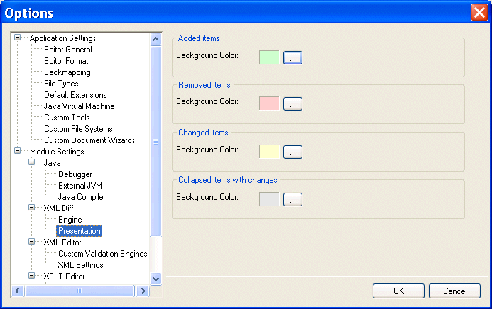 Presentation options allow you to modify the settings for the background colors Stylus Studio uses to identify the types of changes detected in diffed documents and folders