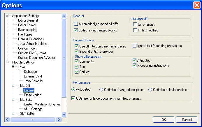 Calculating such a list can be time-consuming and resource intensive, and these costs might not be worth the benefits to a given user. For this reason, Stylus Studio provides settings that let you tune the diffing algorithm used by the XML Diff engine. Tuning settings are displayed in the