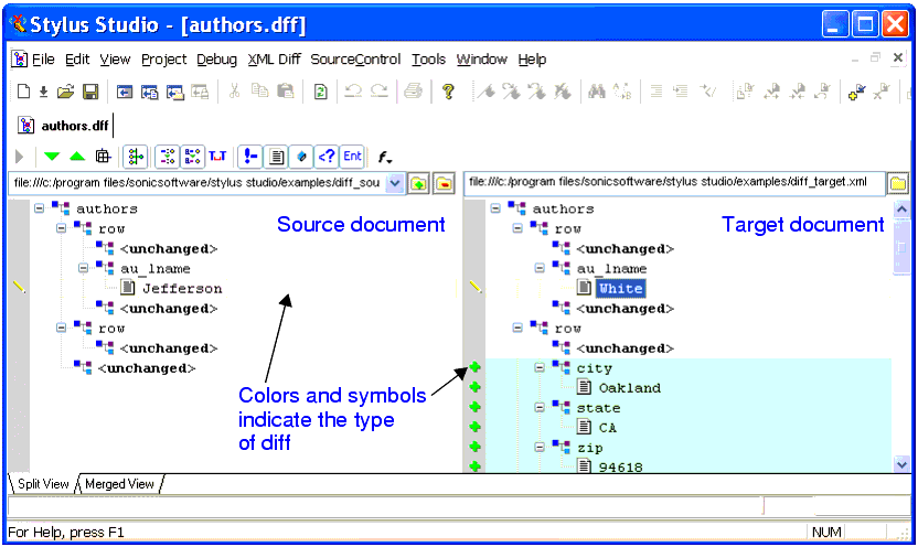 Customizable color-coding lets you quickly determine how one document differs from another - green, for example, identifies objects (such as elements and attributes) that are present in the target document, but which do not exist in the source document. When you hover the pointer over symbols displayed in the side bars of the source and target document windows, Stylus Studio displays a tool tip that indicates the specific nature of the change.