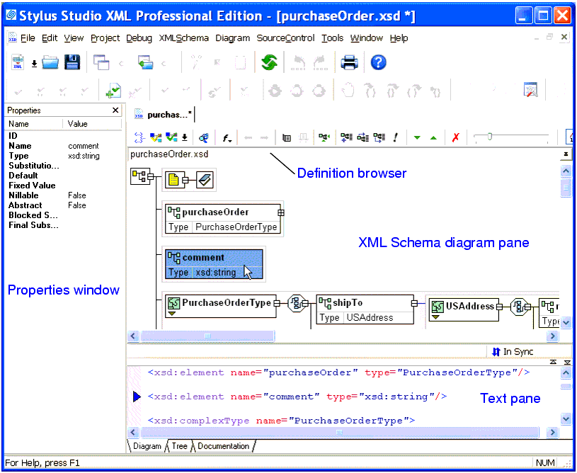 If you were to scroll up either the text pane or the diagram pane, you would also see, for example, the complete definitions for other global complexTypes such as