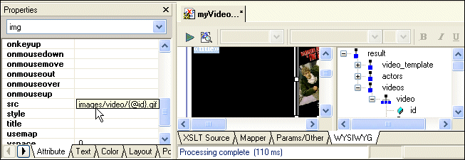 In the Properties window, Stylus Studio displays the properties for the image. If you scroll down to the src property, you can see that the value is images/video/{@id}.gif.