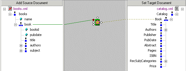Mapping Source and Target Document NodesYou map a source document node to a target structure node using drag and drop to create a link between the two nodes. Stylus Studio composes XQuery code based on these maps. This section covers the following topics: Preserving Mapper LayoutAs you add function blocks to the XQuery mapper, Stylus Studio places them in the center of the mapper canvas. You can change the default placement of function blocks by dragging and drag and dropping them where you like. Stylus Studio preserves the placement you select within and across sessions (as you toggle between the mapper and the XQuery Source tab, for example).