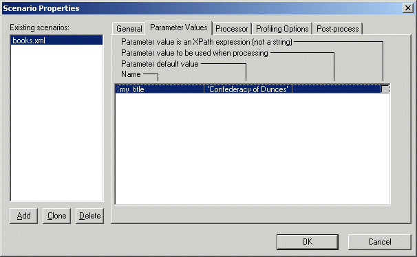 For more informationSee Source Documents to learn more about the process of selecting and working with source documents in XSLT mapper. Setting Values for Global ParametersThe Parameter Values tab of the Scenario Properties dialog box displays any global parameters you have defined in the XSLT source and allows you to For example, imagine the following parameter defined in the XSLT source: