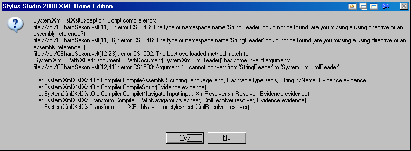 When I run it in the SS Enterprise Edition Build 377i it gives me an error. The error I am getting is easy reproduce with 2 files (XML and XSLT) in the attachment.