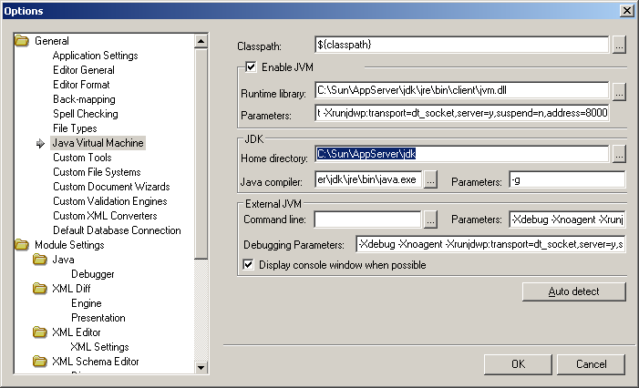 - You can enter "c:\sun\appserver\jdk\jre\bin\java.exe" in the "Exernal JVM > Command Line" field; that should take care of fixing the TRANG problem you have reported