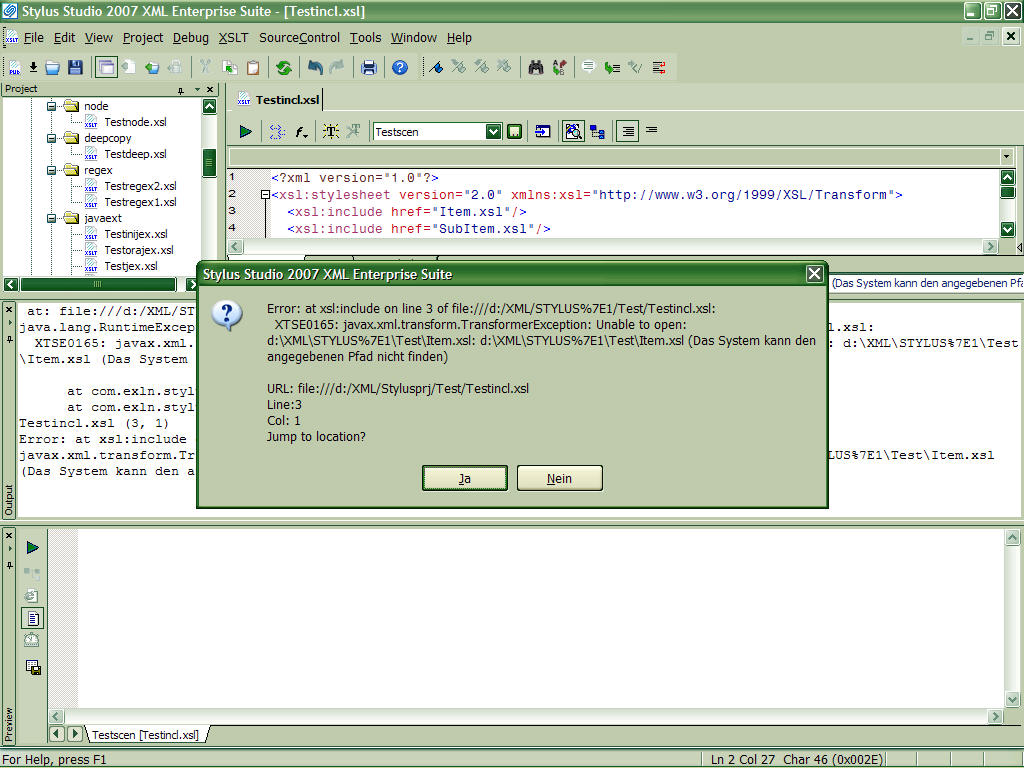 the mechanism for the resolution of relative paths in xsl:include statements seems to be broken (at least) for the Saxon 8.9 processor implementation in Stylus Studio 2007 R2 Enterprise (see patherr.jpg). Using a native Saxon 8.9B as custom processor works ok.