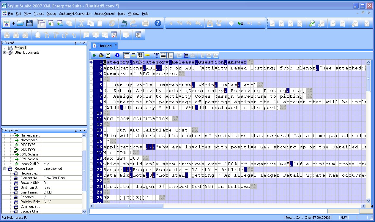 2) has double-quotes to delimit fields. Stylus Studio defaults the Delimiter Pairs as "","" When I tried to select "," the Delimiter Pairs automatically displays '\",'\" instead.