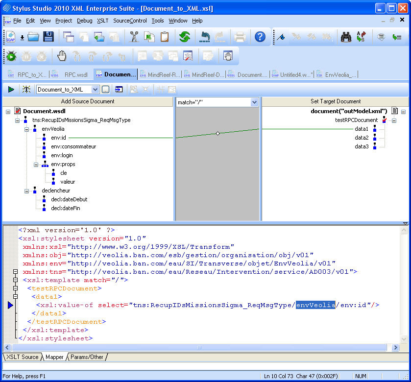 document.wsdl defines a global element RecupIDsMissionsSigma_ReqMsgType, notice that elementFormDefault is not set therefore by default is unqualified; both local elements envVeolia and declencheur are unqualified.